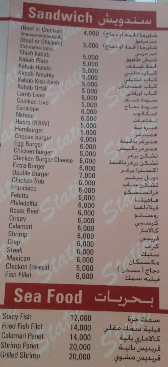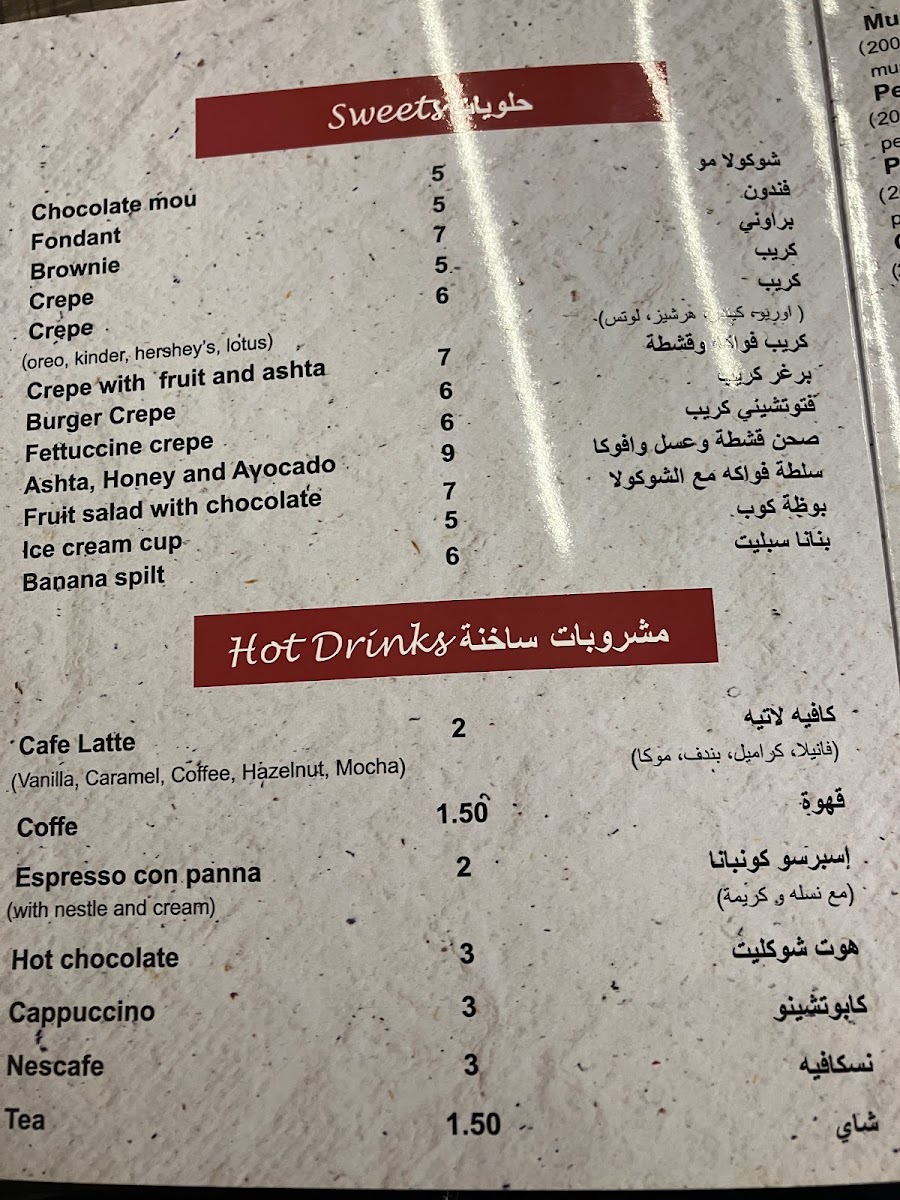 Mahatta Restaurant Omacli in Hadath, Lebanon, offers a delightful mix of dishes that cater to a variety of tastes. The menu features a wide range of options, ensuring that there's something for everyone. The Salad is a fresh and vibrant choice, perfect for those looking for something light and healthy. For a more substantial meal, the Shawarma Combo is a standout, offering a generous portion of tender, flavorful meat that pairs perfectly with sides. Pairing any of these with a refreshing Water Bottle ensures a well-rounded meal. Those with a sweet tooth will be pleased by the Crepes, a delicious dessert that adds a touch of indulgence to the meal. For a heartier option, the Well Done Steak in Gravy Sauce is a must-try, with the rich, savory gravy enhancing the steak's robust flavors. Overall, Mahatta Restaurant Omacli provides a satisfying culinary experience with a menu that combines both traditional and modern flavors, making it an excellent choice for any occasion.